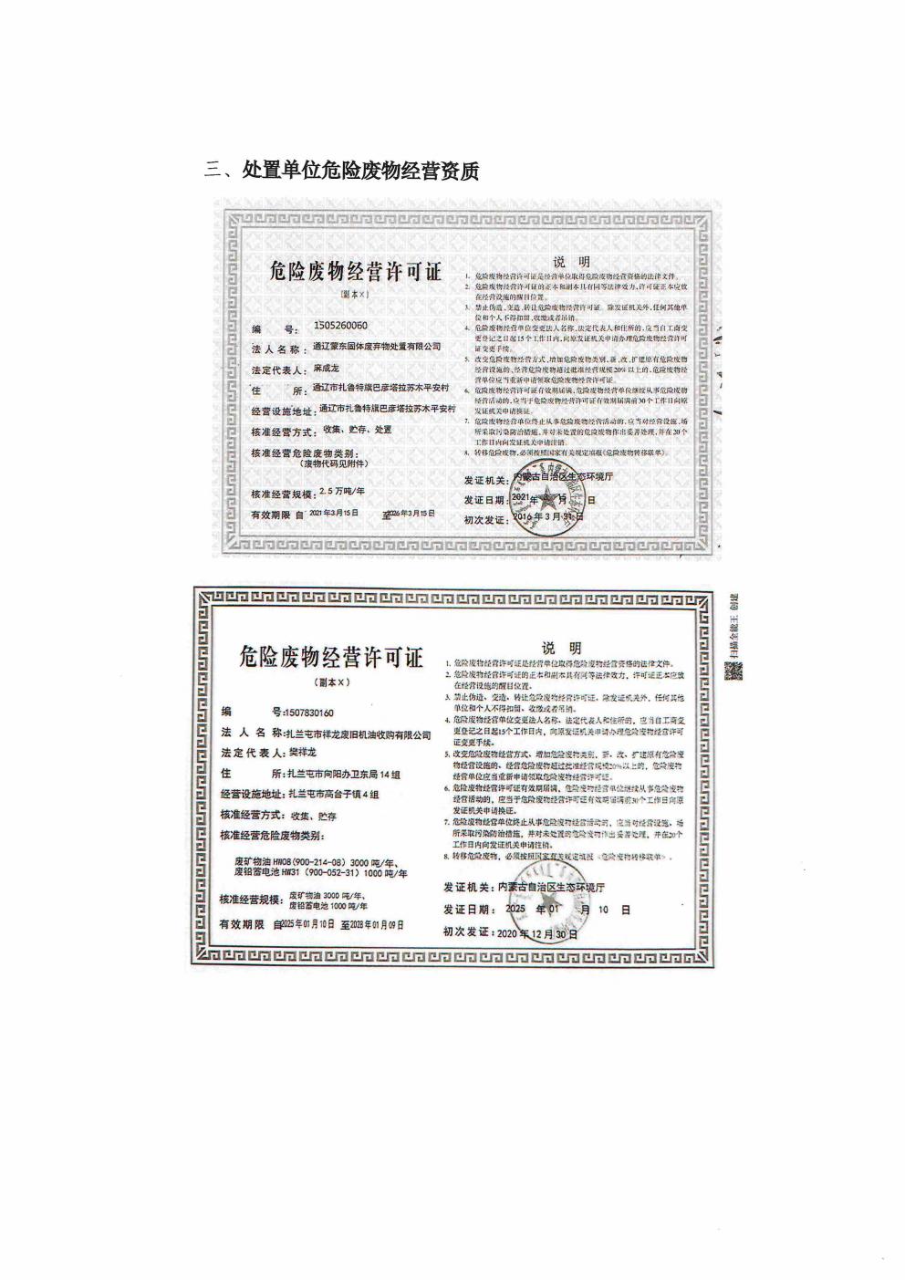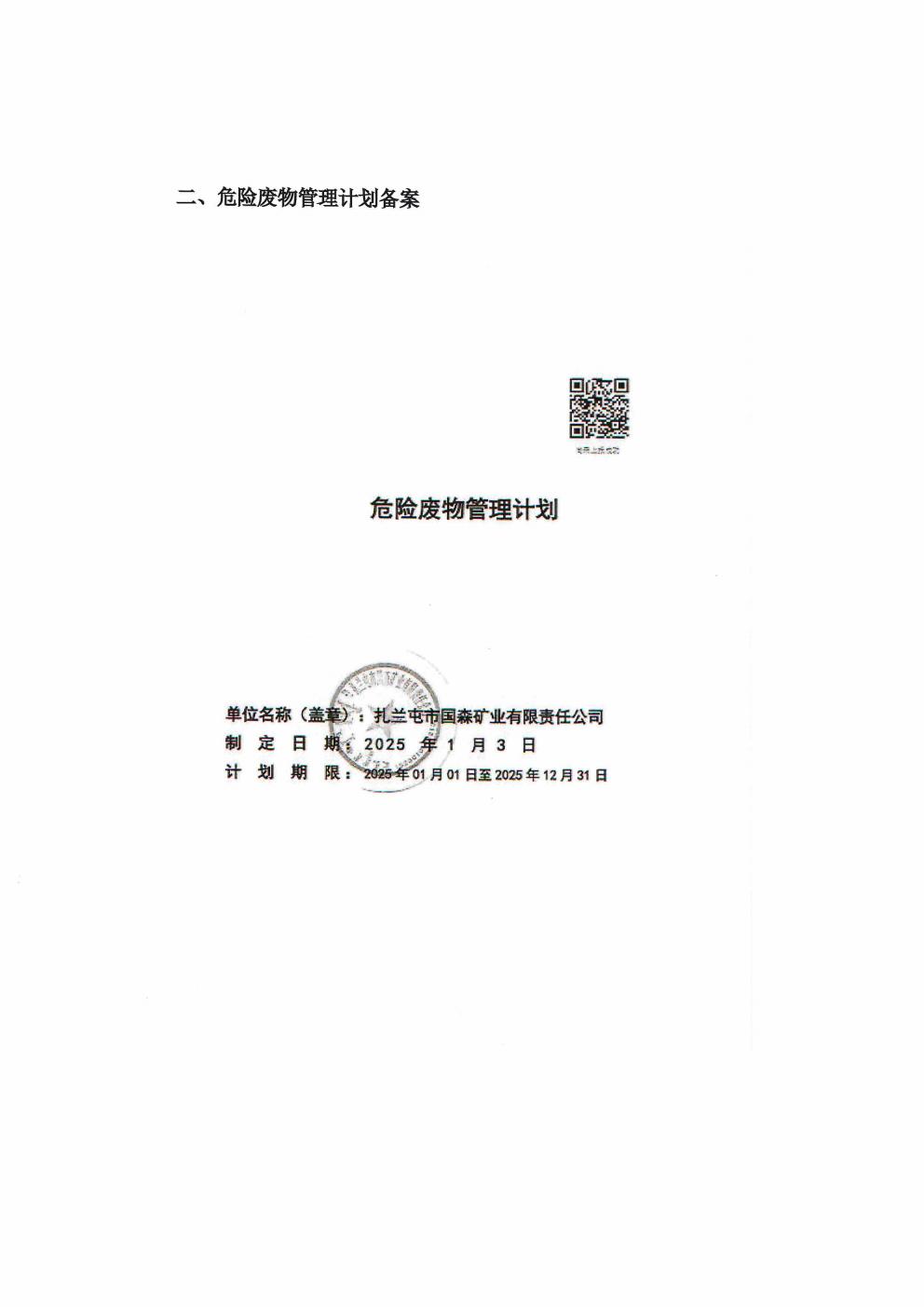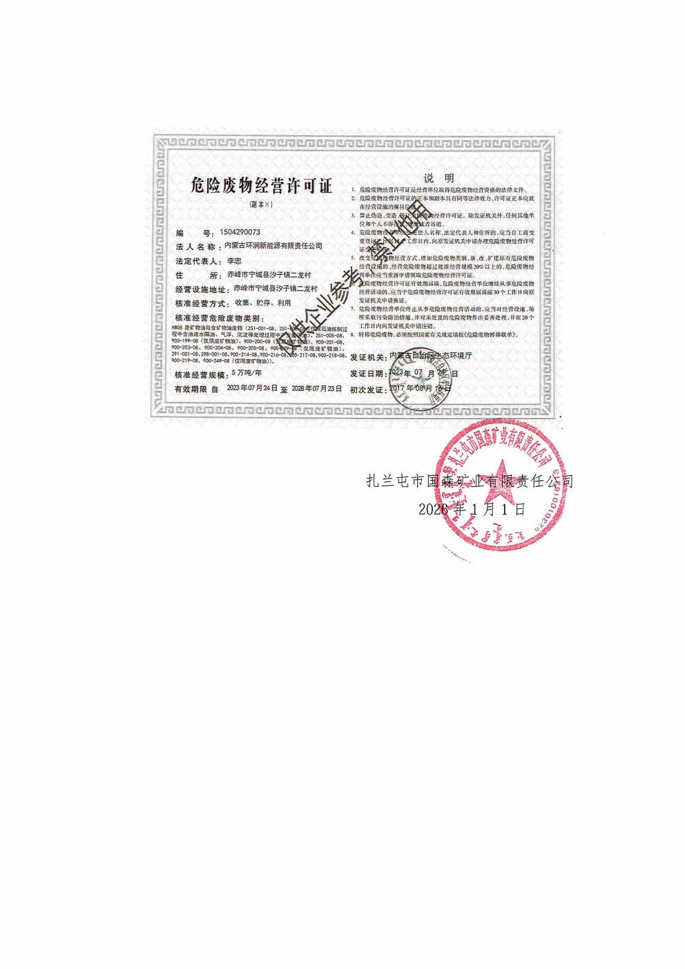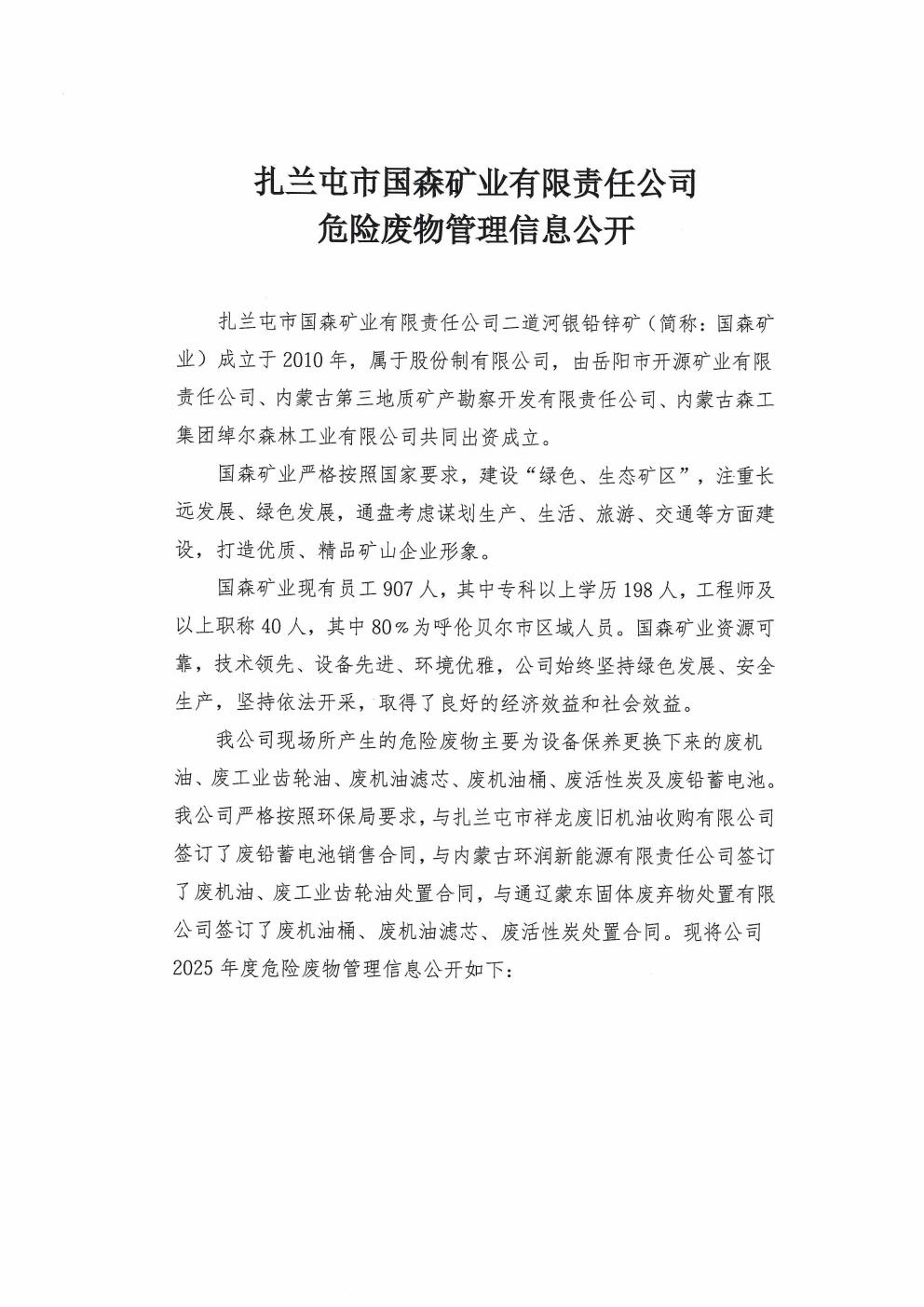 扎蘭屯市國森礦業有限責任公司 危險廢物管理信息公開